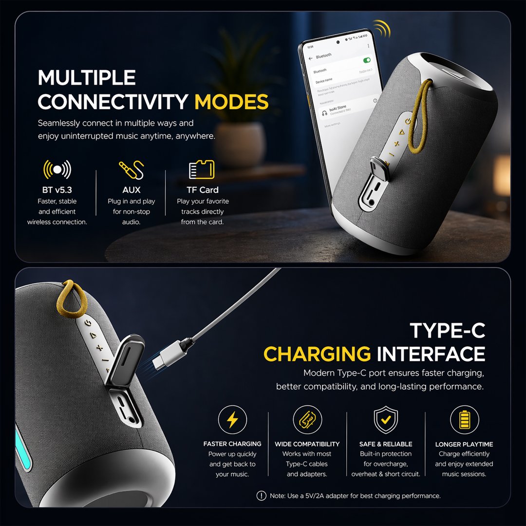 The speaker comes with Bluetooth v5.3 connectivity, offering seamless pairing and stable connection across devices. You can also enjoy multiple connectivity options like AUX and USB, giving you flexibility in how you play your music.