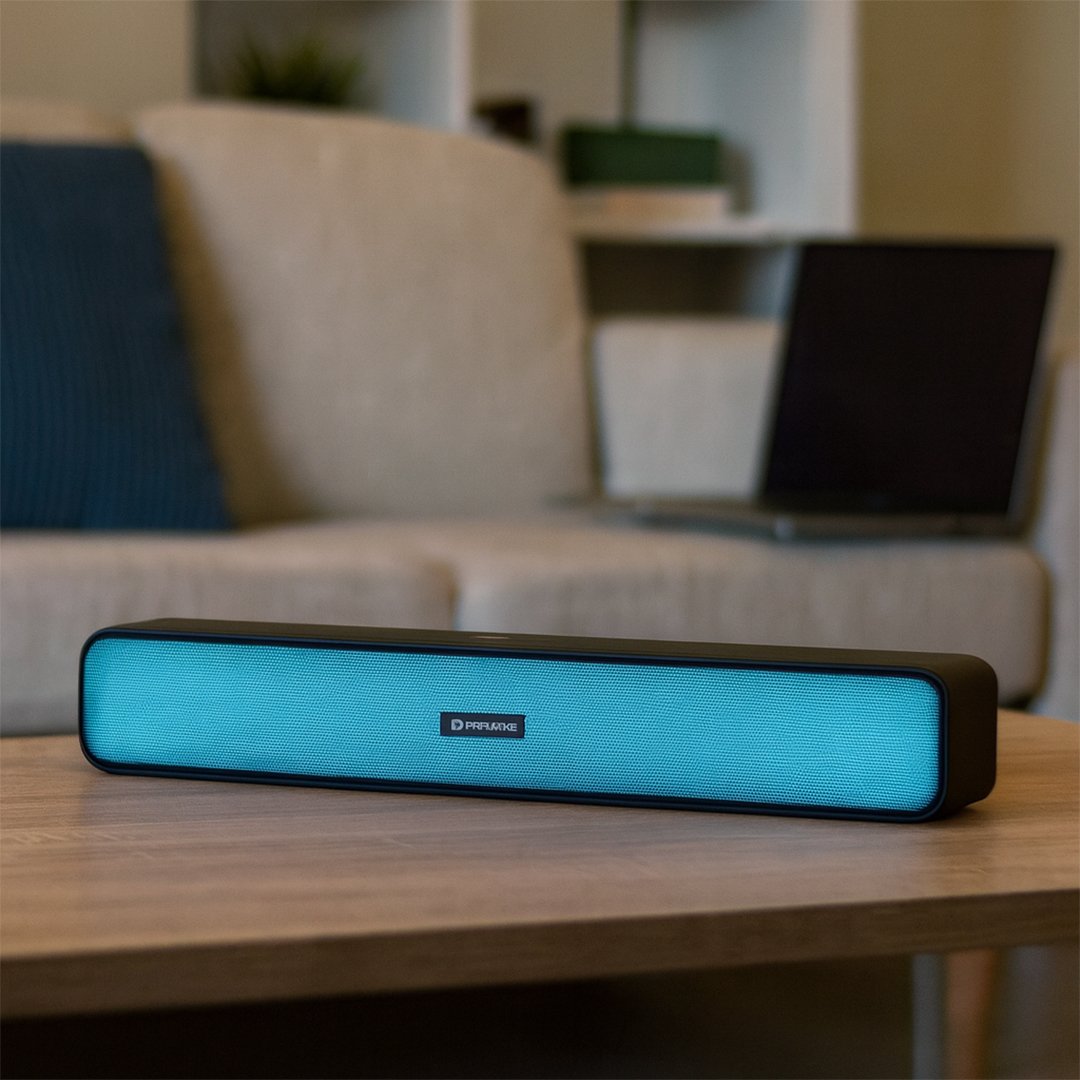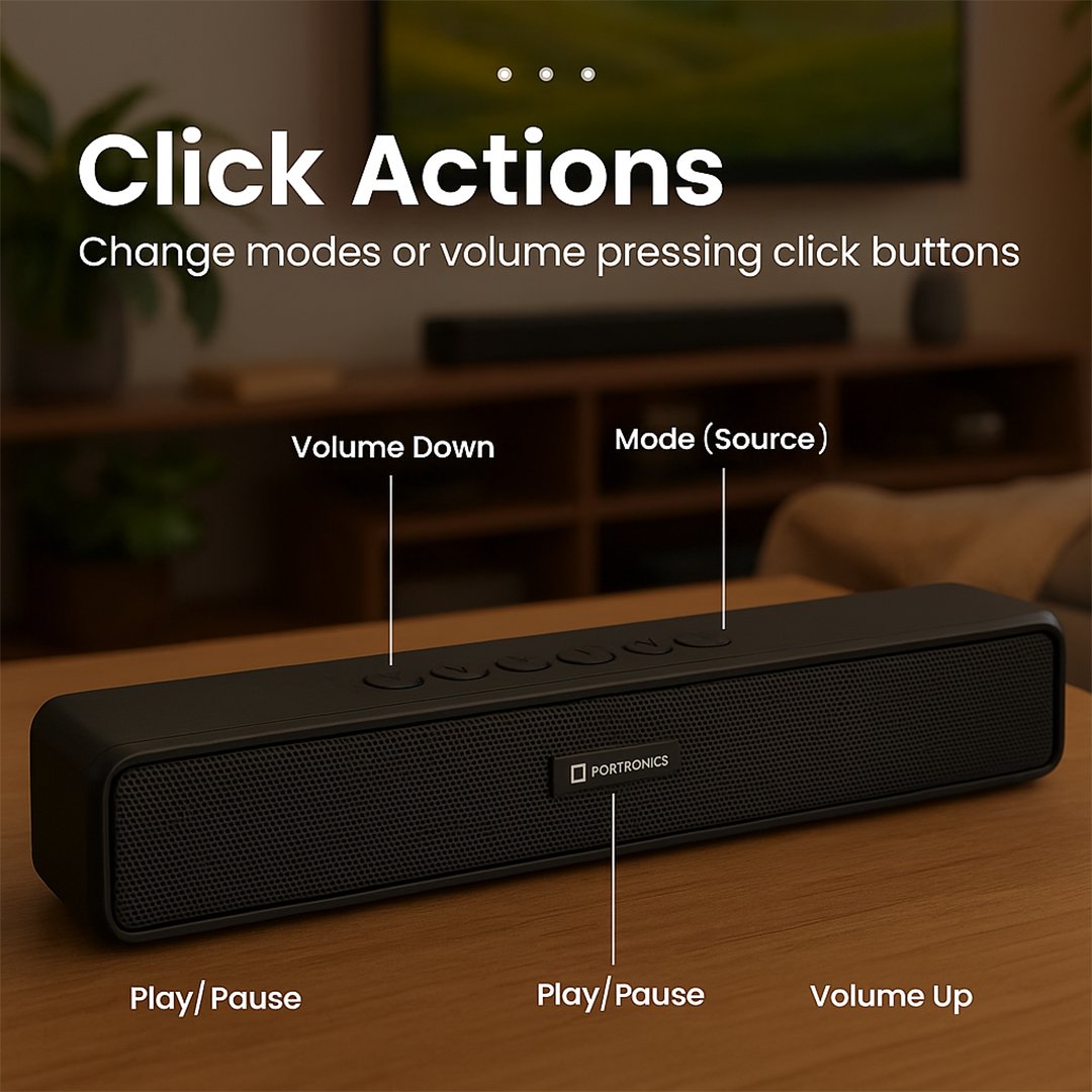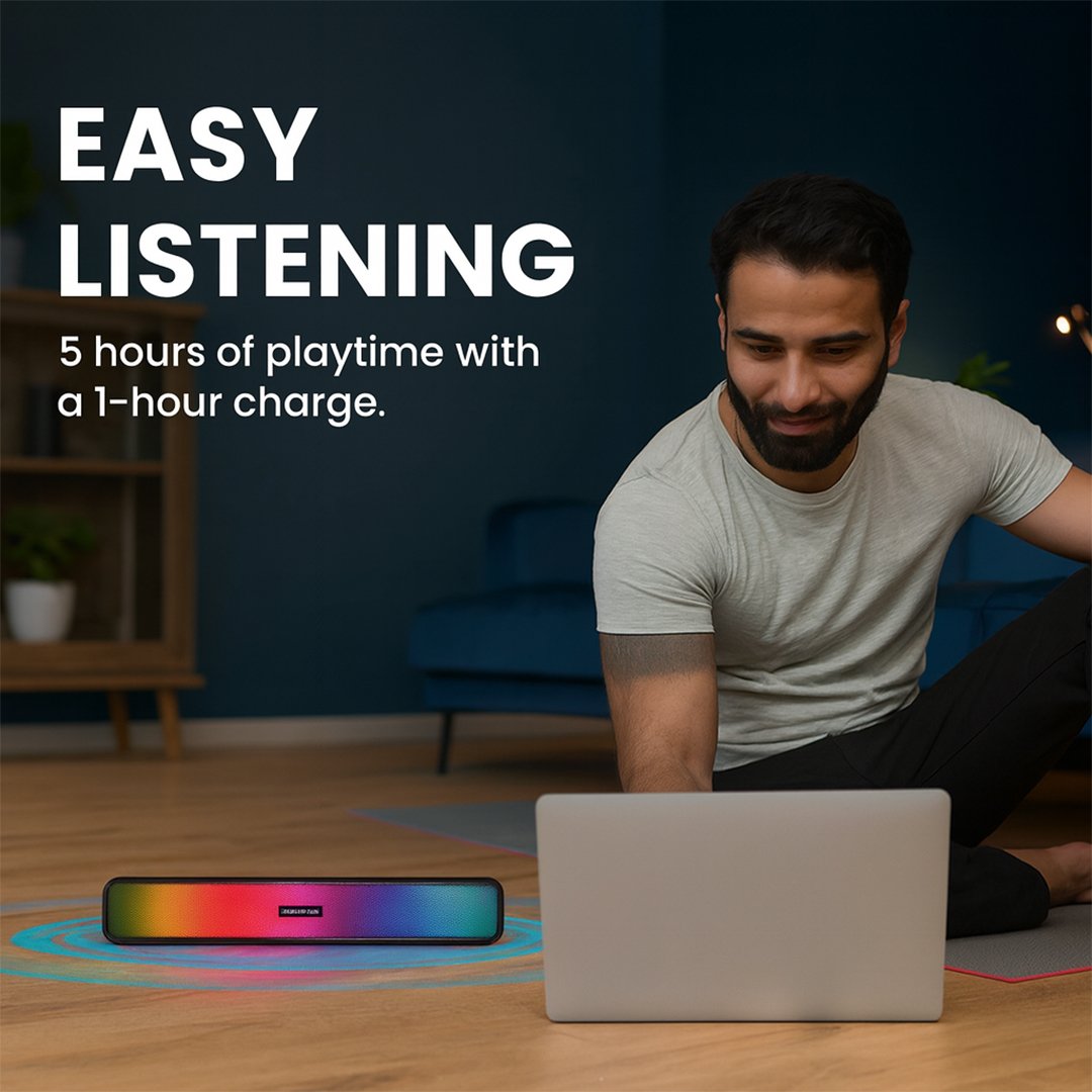 The Type-C charging port ensures faster recharging, while the LED accent light on the front adds a modern touch to your setup. Crafted with a premium fabric finish and compact bar design, Portronics Radian is perfect for your living room, study, or office desk.