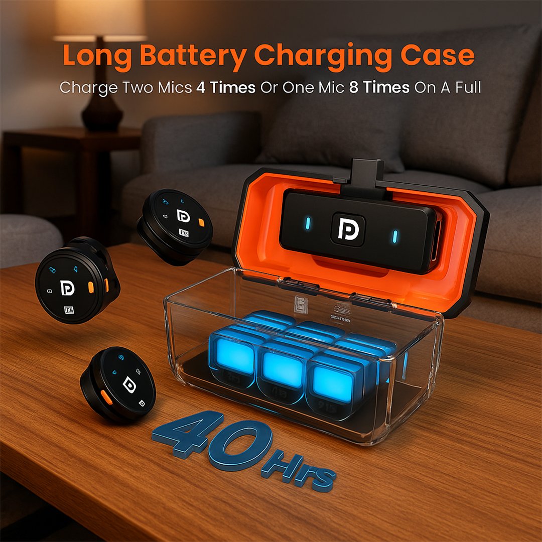 Enjoy uninterrupted recording sessions with up to 40 hours of total usage time powered by the long-lasting charging case. With a 30-meter wireless range, low latency, and HD audio transmission, you can record, stream, or conduct interviews without any delay or distortion.